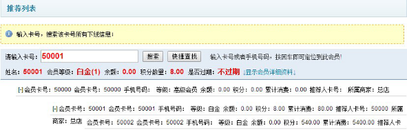 在我们会员软件里面有八的会员推荐制度,现在一新的系统里可以查看并管理会员推荐的下线人员。有自己推荐人的记录,和自己推荐下线的人员统计,包括积分,累计消费,手机号码,会员等,推荐人卡号。