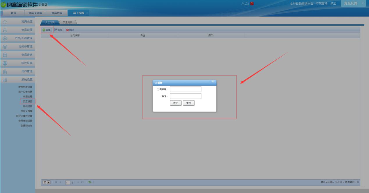 1.登陆蓝冠注册会员管理系统-----系统设置----员工设置,第一步点击新增员工分类,分类员工的别,例如:店长、店员。 第二步点击员工列表,新增员工,填写员工的信息,选择提成方式,我们蓝冠注册软件提成方式有四种:售卡提成、充次提成、快速消费提成、商品消费提成,提成的方式自由勾选。