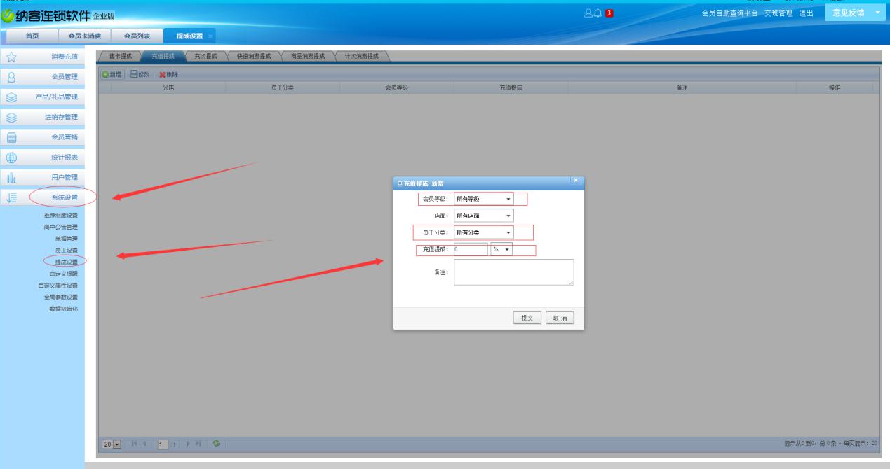 2.添加员工并设置好上述提成方式之后,就要设置每个提成方式员工的金额获得比例,点开系统设置----提成设置,在每个提成方式的下面都有一个新增,点开新增设置,里面的可以设置针对所有会员等,也可以针对单个会员等,也可以设置针对所有员工分类和单个员工分类,提成比例框里有两种选择方式:元或者%,元就是直接获得金额,%就是按消费的金额的百分比来进行获得