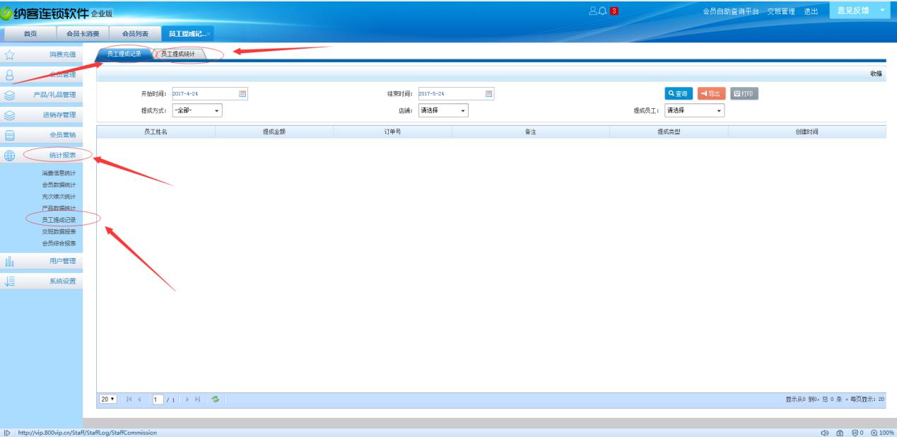 3统计报表----员工提成记录,这里可以根据各种维度去查询员工的提成报表,并可以导出打印。