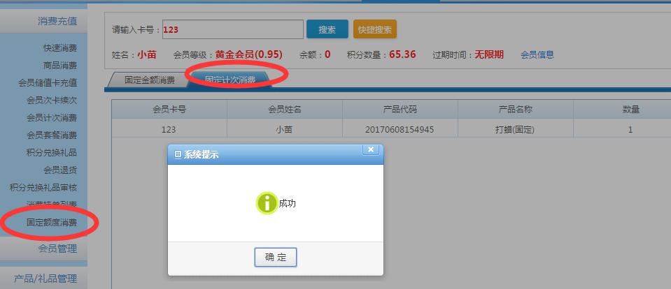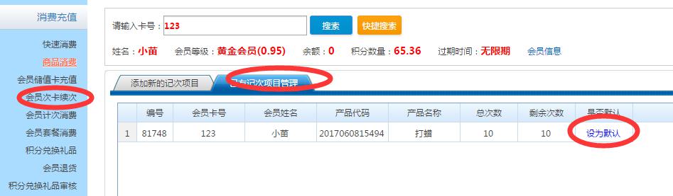 固定计次消费就稍微复杂一点,先要给会员充值次数,充值完后需要在充值续次页面,已有计次项目进行次数产品默认,如下图。