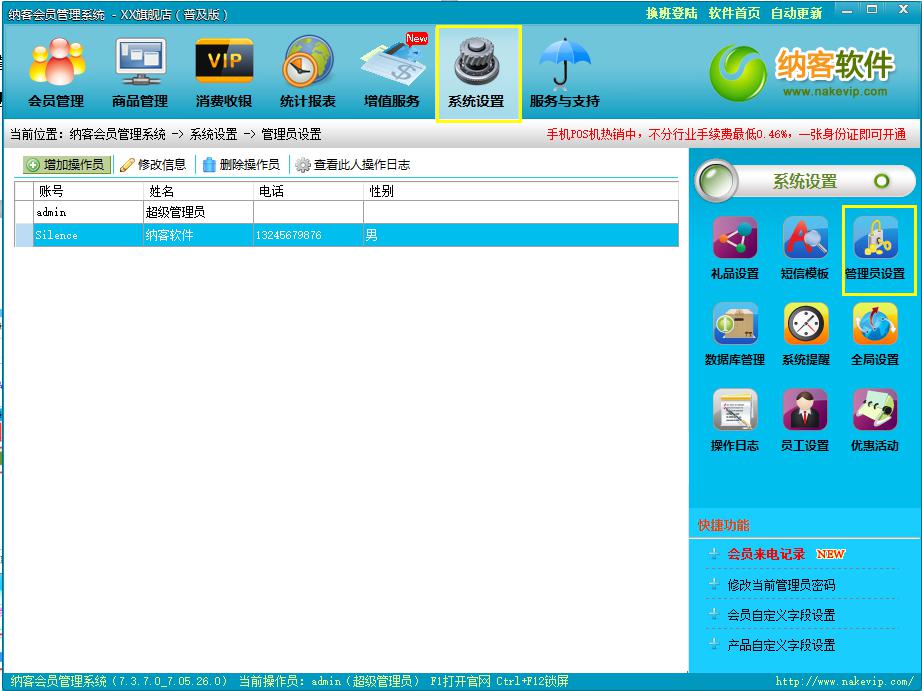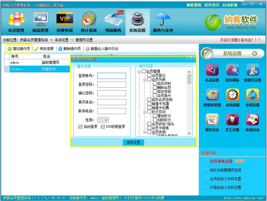 点击增加操作员,然后输入登录账号、密码等,然后勾选权限,进行权限设置。设置完毕之后,点击保存设置即可。