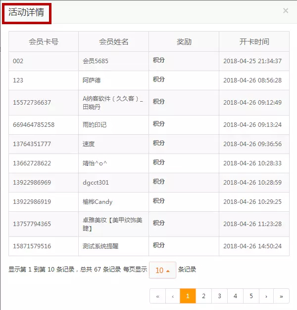 活动时间截止后,营销并没有停止。在【营销】→【营销中心】→【活动营销】→【新人有礼】→【活动统计】界面中,可以看到活动的参与人数,以及参与人员的姓名、奖励、开卡时间这些具体数据。