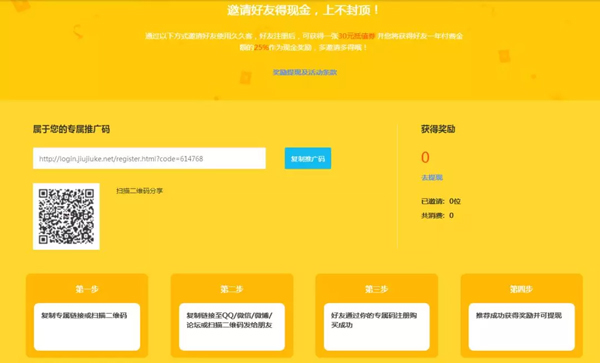 会员可以通过分享二维码的方式来获得收入,邀请好友注册使用久久客,即可获得25%的现金奖励。