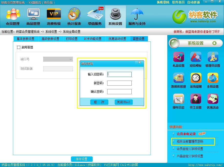 完成各项需要权限的操作时,需要使用到管理员密码,如删除会员信息时,一防止他人恶意删除数据,需要输入管理员才能执行这项操作。