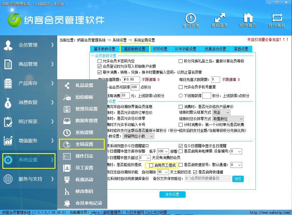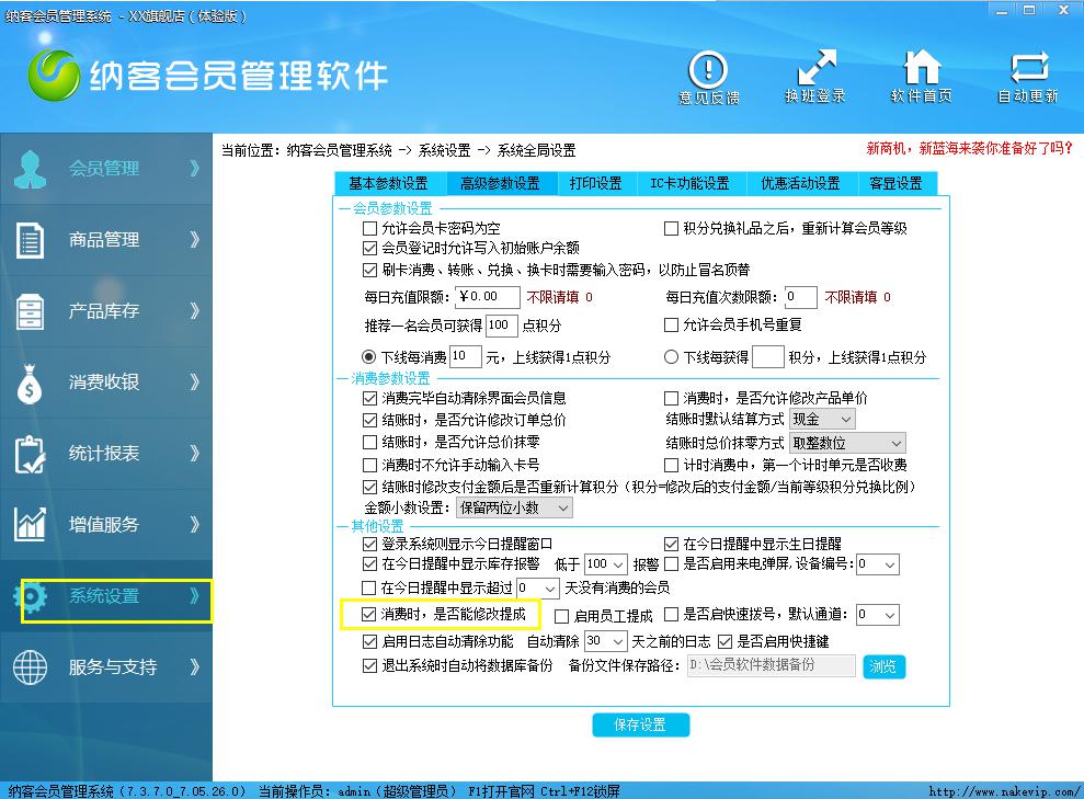 如果需要随时修改提成比例,可以在系统管理---全局设置----高参数设置,勾选“消费时,是否能修改提成”即可。