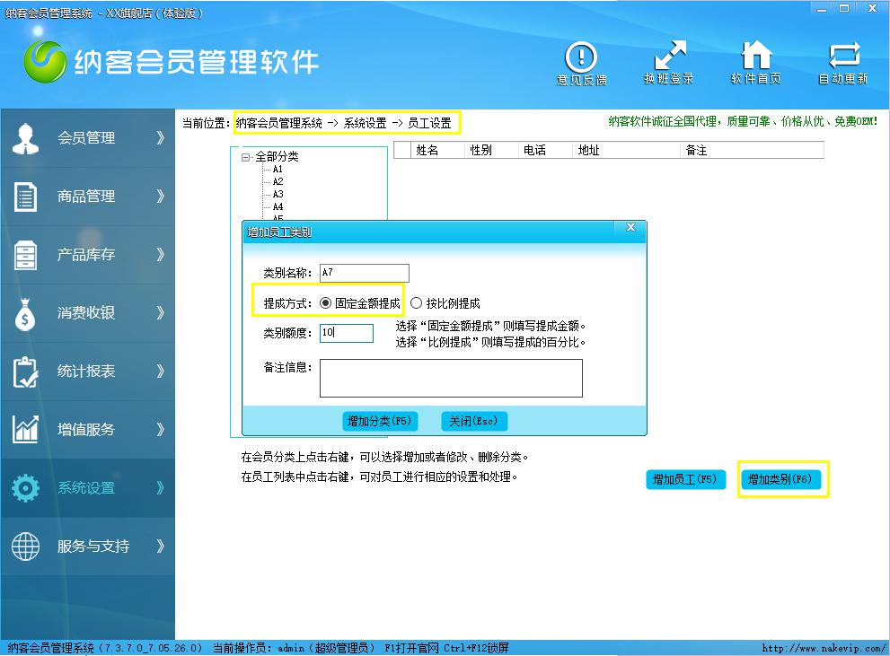 然后添加员工分类,在员工分类中选择固定金额提成,输入数值10,然后点击增加分类。