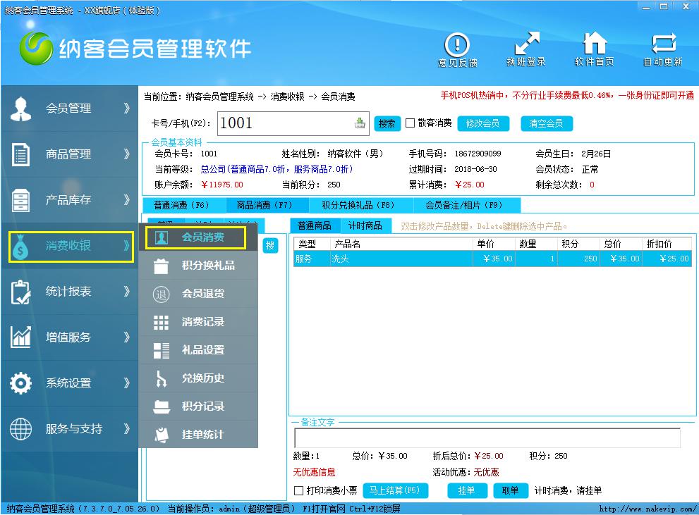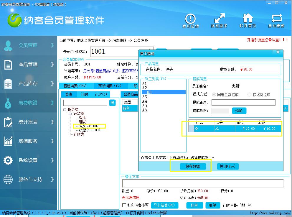 第三步,在会员消费时,选择服务类----洗头,双击洗头可以选择员工名字点击添加员工。