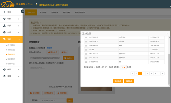 4、可以在系统中事先编辑好短信模版,想要给会员发送短信时,直接套用模版就可以了,方便快捷,提高了工作效率。系统可以单独给某个会员发送短信,也可以群发短信。
